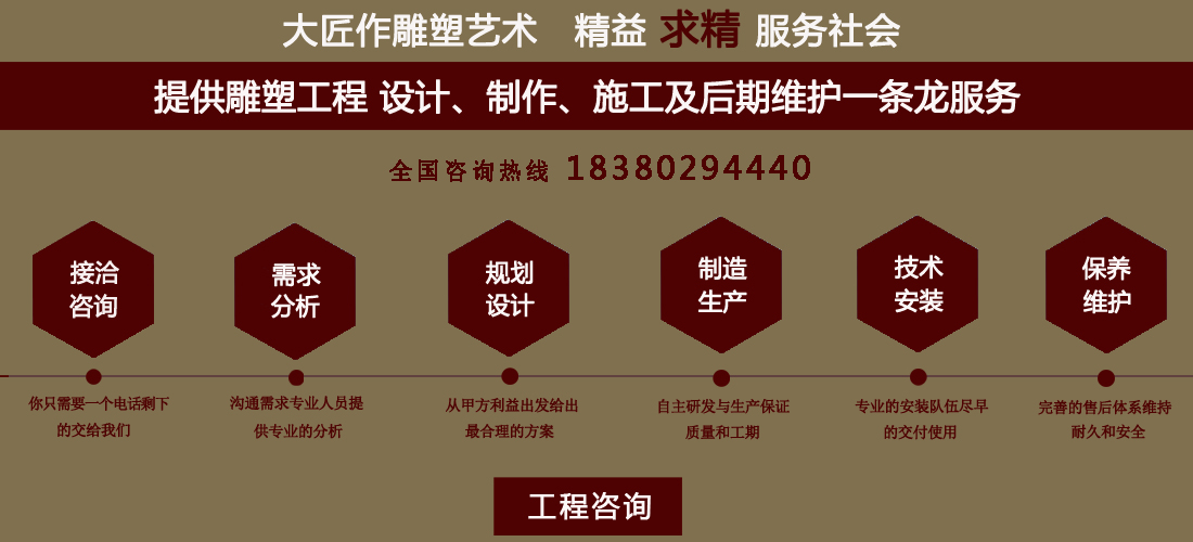 成都大匠作雕塑有限公司,是經(jīng)成都工商局審定注冊的正規(guī)專業(yè)雕塑制作及工程安裝服務(wù)機構(gòu),是由一群年輕富有朝氣的年輕人創(chuàng)辦,發(fā)軔于四川省成都市龍泉驛區(qū)。它是一家******于創(chuàng)作、制作和銷售為一體的公司。大匠作擁有多年從事公共藝術(shù)的專業(yè)人員和雕塑制作人組成的核心團隊,為您提供專業(yè)、具創(chuàng)新的設(shè)計及制作服務(wù)。公司成立以來,秉承“******服務(wù)、誠信為本”的宗旨,以客戶需求為目標導向,不斷學習,進取,優(yōu)化和提高服務(wù)質(zhì)量,公司向您******——“您的滿意***是我們的信譽”,我們將以飽滿的熱情和******的服務(wù)贏得您的贊譽和支持。 愛心,細心,耐心,責任心是我們的要求,盡心盡職,為您打造出創(chuàng)新、專業(yè)、******的設(shè)計方案,我們堅信先做人、后做事,用心對待客戶,實行透明收費,人性化服務(wù),本著對客戶負責,對客戶負責,更是對自己發(fā)展負責的態(tài)度,爭取做到讓每位客戶滿意